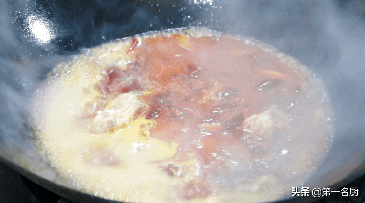 5、炖煮:再添入一次开水,继续煮10分钟,第三次加入开水,水的量要漫住大骨头,然后盖上锅盖,改最小火继续炖煮1个小时。
