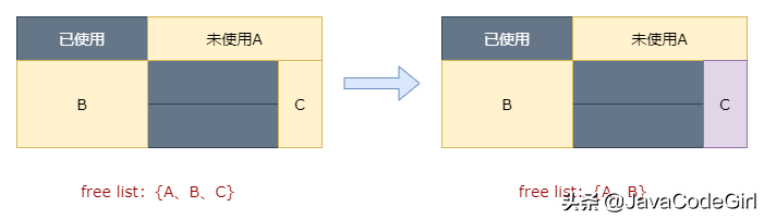 空闲列表分配:当内存使用的GC算法是标记清除算法时,内存是规整的,这个时候维护了内存空闲的列表,在为新对象分配内存时从空闲列表中找到内存就可以。CMS使用的GC回收算法是标记清除算法,内存的分配方式就是空闲列表分配。