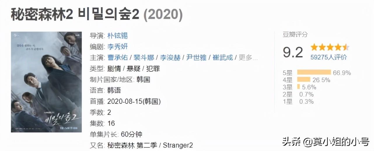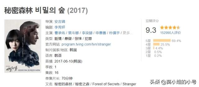《秘密森林》系列第一季上线于2017年,第二季在2020年上线,评分分别为9.3分与9.2分。其中为《秘密森林1》打分的观众,达到了15.2万人。