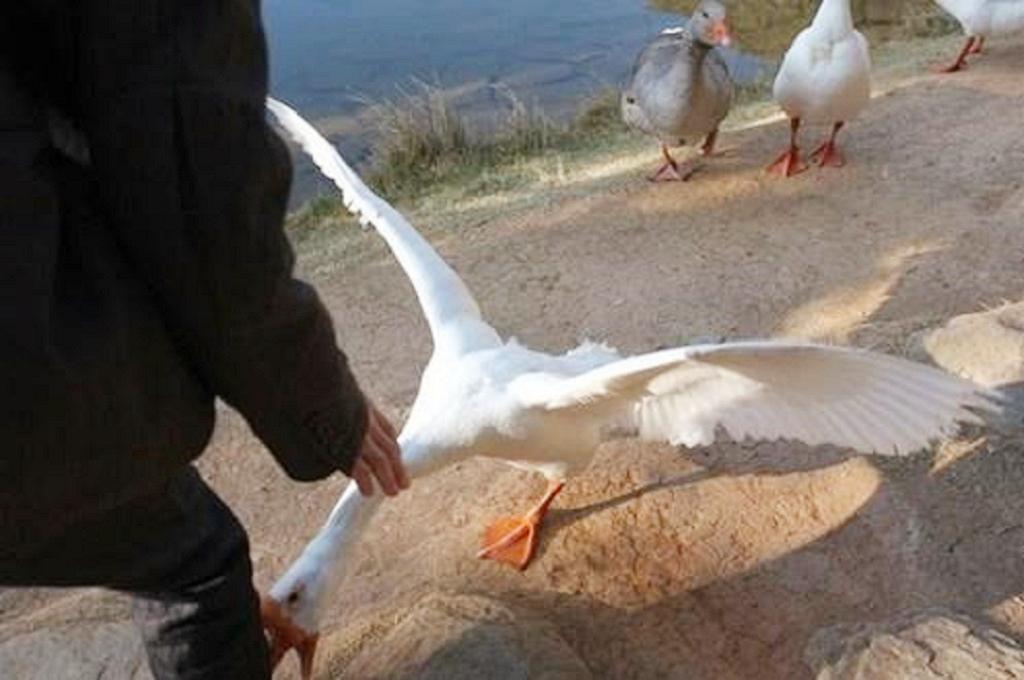 想要体验被鹅咬住感觉的朋友可以用拇指和食指使劲掐住大腿内侧然后用力一拧,完美复现了被鹅咬的感受。人还有控制力道的能力,但是村中一霸的大鹅可不会手下留情,比女性使劲拧的力道大多了,很多时候还会给你造成“血光之灾”。这些都是鹅对付人的法子,如果对手是蛇,那鹅根本就不需要这样大费周折。