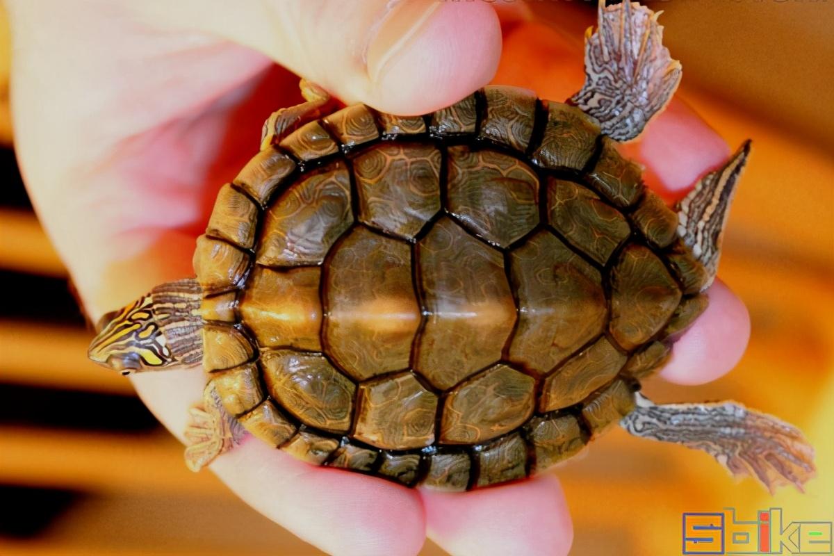 德州地图龟:体形最小的地图龟,背甲橄榄色,带有黄色线条构成的网状图案。盾片突起,脊棱上有低钝的刺突,刺突尖头常呈黑色。腹甲黄色,沿着盾片接缝长有黑色的细线。性格温顺、好动,很适合作为爬行宠物饲养。