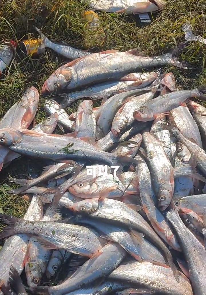 而这几十条大翘嘴鱼在草地上摆了一大片,看起来非常的令人震撼。