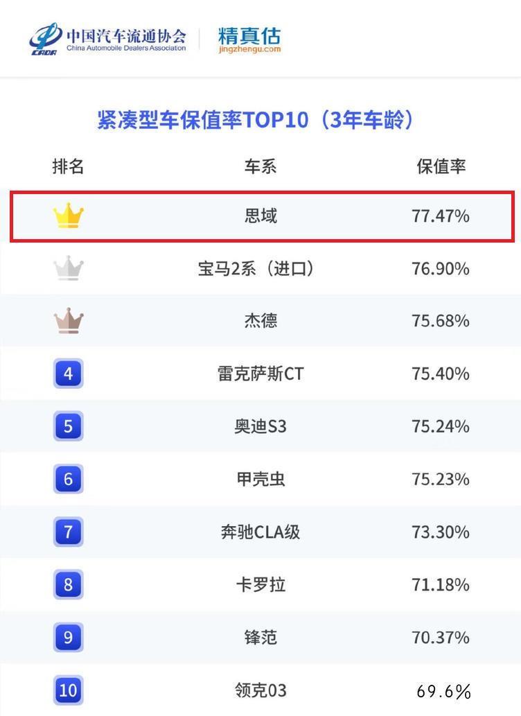 其三是保值率,我们从中国汽车流通协会&精真估获得,思域三年保值率为77.47%,排在紧凑型车第一名,而卡罗拉和领克03三年保值率分别为71.18%、69.6%;思域的保值率要好于对手卡罗拉、领克03。