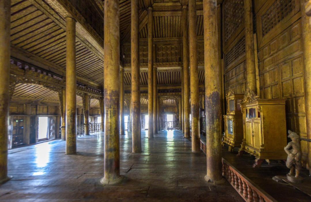 皇宫面积不大,但里面的建筑也很多,有皇帝上朝召见群臣的大殿、居室、嫔妃居住的一大片后宫,金瓦红墙,都是缅式风格,可惜都没有家具陈设。内有古代缅甸文化博物馆,展出当年宫廷的服装、用品和佛教艺术。