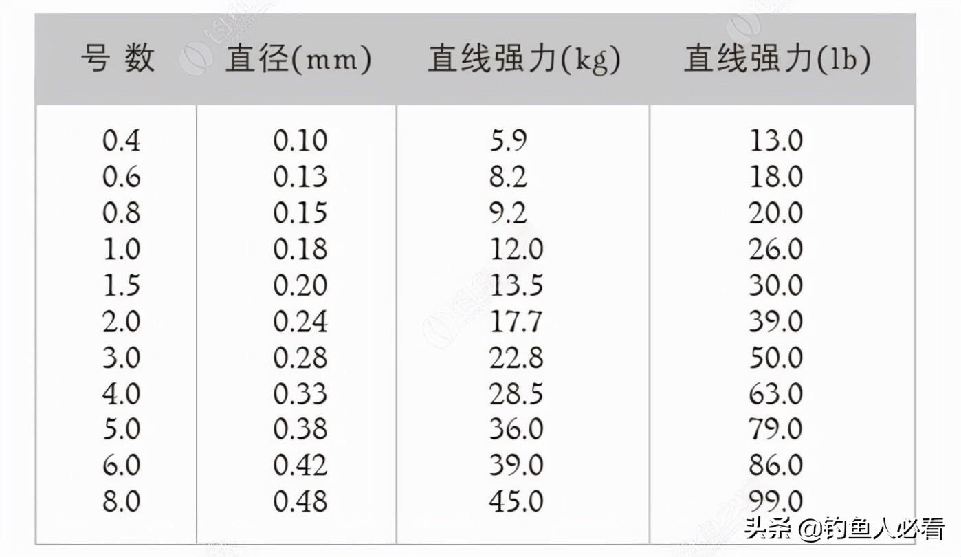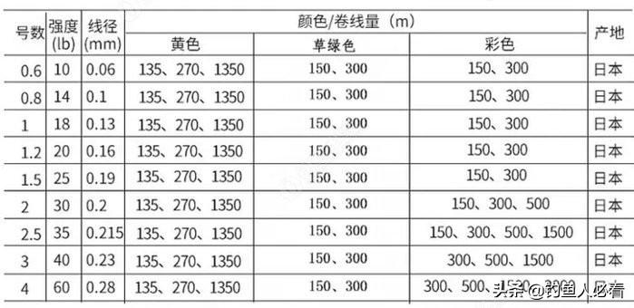 1:无论是碳线尼龙线PE线,一定要看线径和直线拉力值!一定要看线径和直线拉力值!一定要看线径和直线拉力值!不要只关注线号。线号是没有行业标准线径的,每个厂家的产品同线号的线径不一定是一样的。此处列举达瓦和832的线径和拉力值。这就是很多时候大家买的轮子上标注几号线可以上多少的线,但实际上线后的米数却相差甚远的一个重要原因。