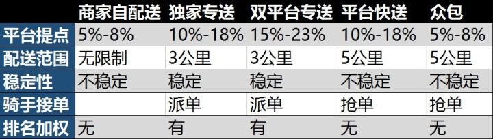配送方式的选择非常重要,配送方式其实主要就是两种:平台专送和自配送,这里面的自配送一般都是指众包和快送,很少有商家自己去送的。那么每个配送方式之间有什么差异呢?让我们来分析一下。