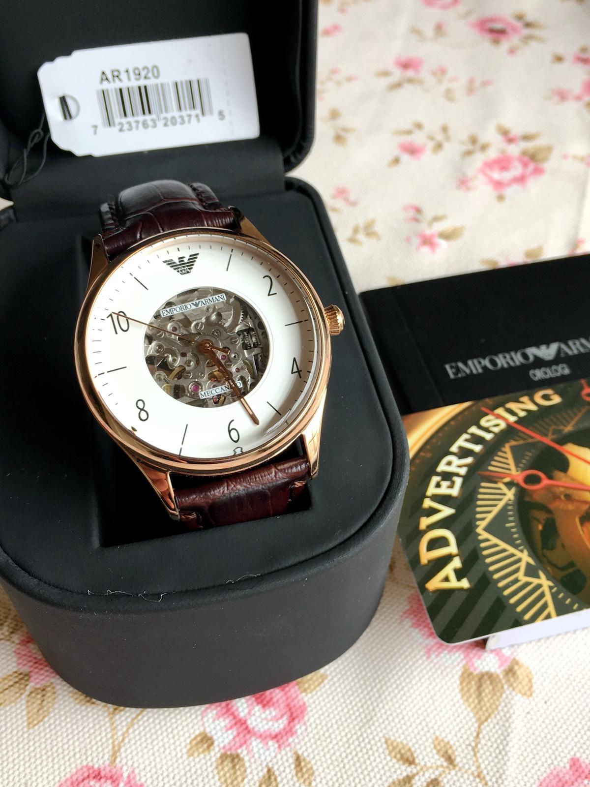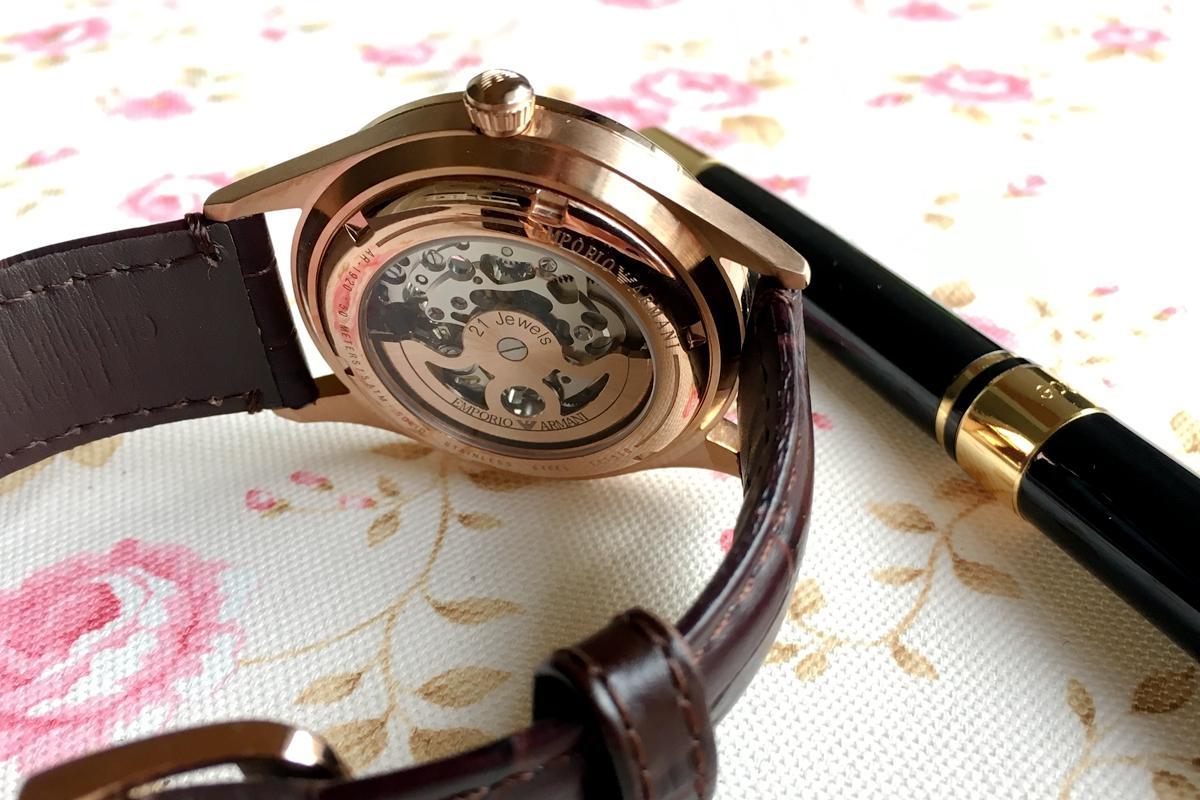 真皮,蛇纹红棕色的表带,也不忘时时的展现自己的“轻奢”使命,也由激光刻录着“阿玛尼”的标牌!