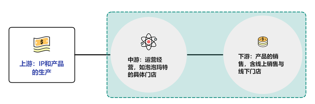 盲盒行业的产业链由上游、中游、下游组成,其中上游为IP、产品生产;中游为运营经营;下游为产品销售,整体产业链结构较为清晰简单。