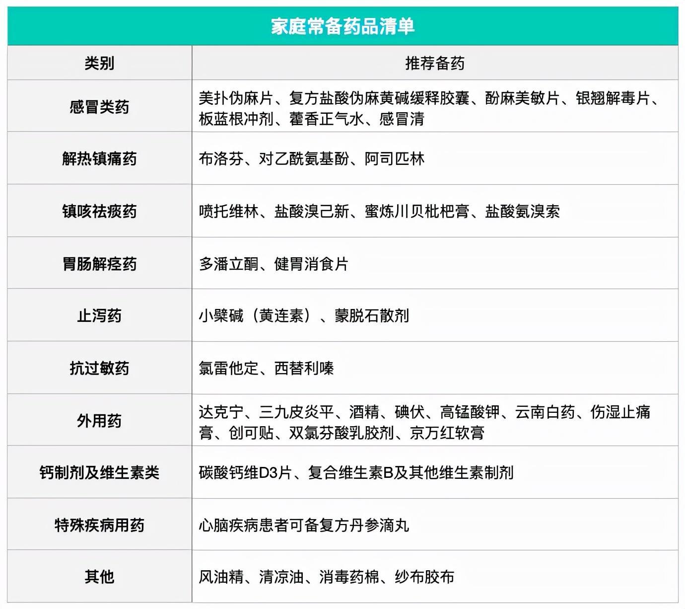 家庭可以常备解热镇痛药物、治疗腹泻的药物、治疗胃病的药物、抗过敏药物、消炎药,以及一些简单处理外伤的药品;如果自身有基础疾病,还需要备上已经在服用的药物。