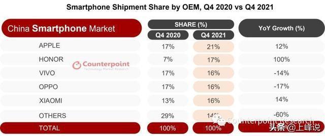 而对国产手机来说,更不幸的是,苹果手机在中国的市场份额创新高——2021年第四季度,苹果手机在中国的份额高达21%,而2020年第四季度它在中国市场的份额为17%。