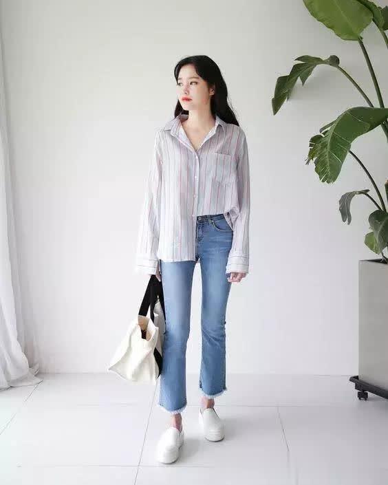 直筒裤更适合春季出门穿,既能保证温度又能修饰腿型,对于腿部纤细但腿型不好的女生是有很大帮助的,利落的线条让腿部更显修长笔直,这样与衬衫搭配非常时尚又休闲。