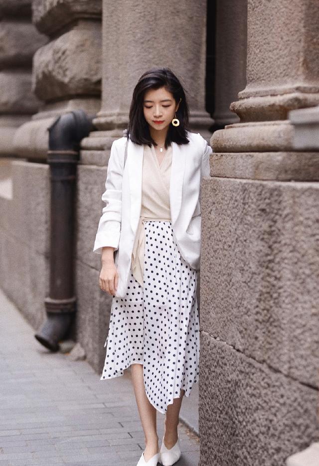 西装外套可以选择轻薄的面料,垂感更强,可以更好的修饰上半身的身材,下装可以搭配一条半身裙。