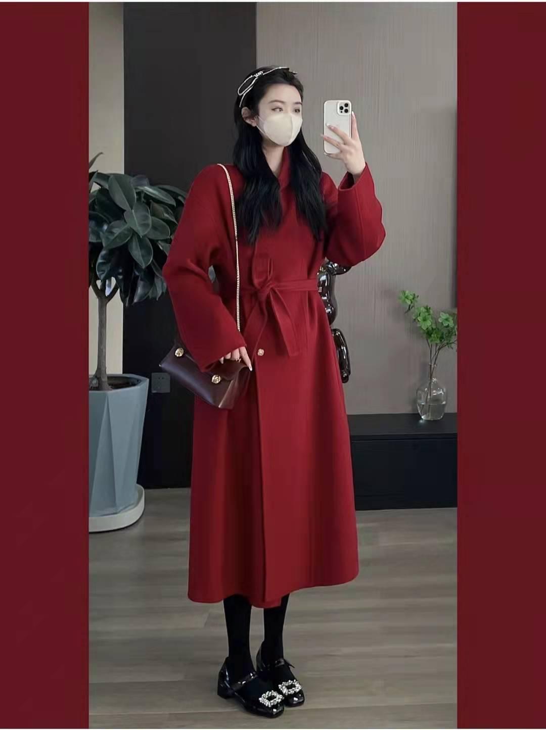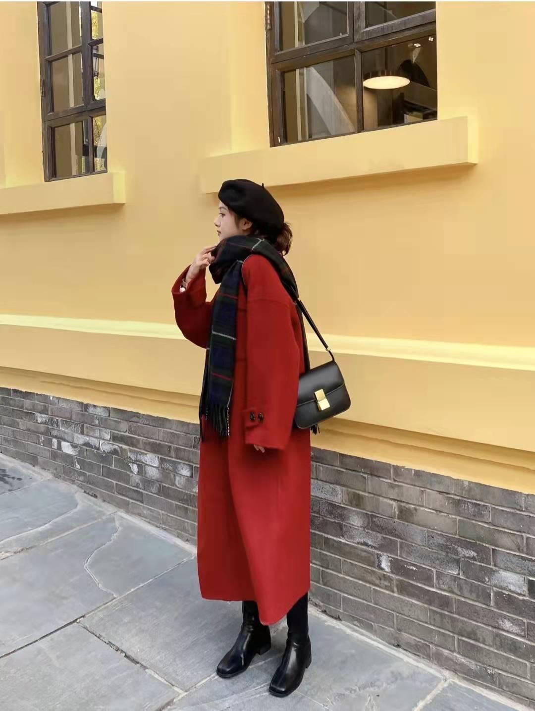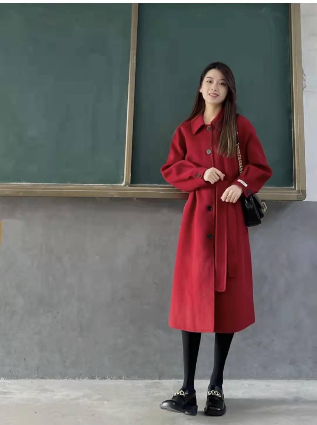 红色大衣搭配:这个正红色大衣真的绝了,是漂亮的正红,加上90%羊毛+10%羊绒的质感,简直无敌,过年穿,订婚穿,结婚穿都是非常好的选择,内搭白色毛衣和白色阔腿裤+小白鞋,一套红白配色高级又显温柔。