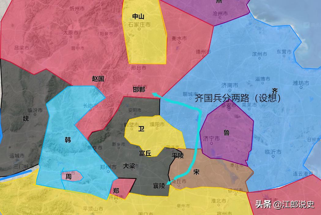 从地图上看大梁和邯郸几乎在同一经度,齐国攻打大梁那魏国主力必定会班师回救,同时也会走一条直线,毕竟两点之间直线最近。