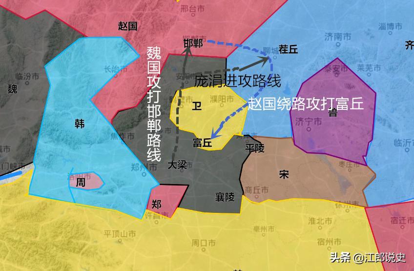 魏国并没有帮卫国收复富丘,反而是径直攻打赵国国都邯郸,同时派遣庞涓攻打茬丘可以肯定的是魏国在当时一定是兵分两路的,带兵攻打邯郸的并不是庞涓,而是另有其人。