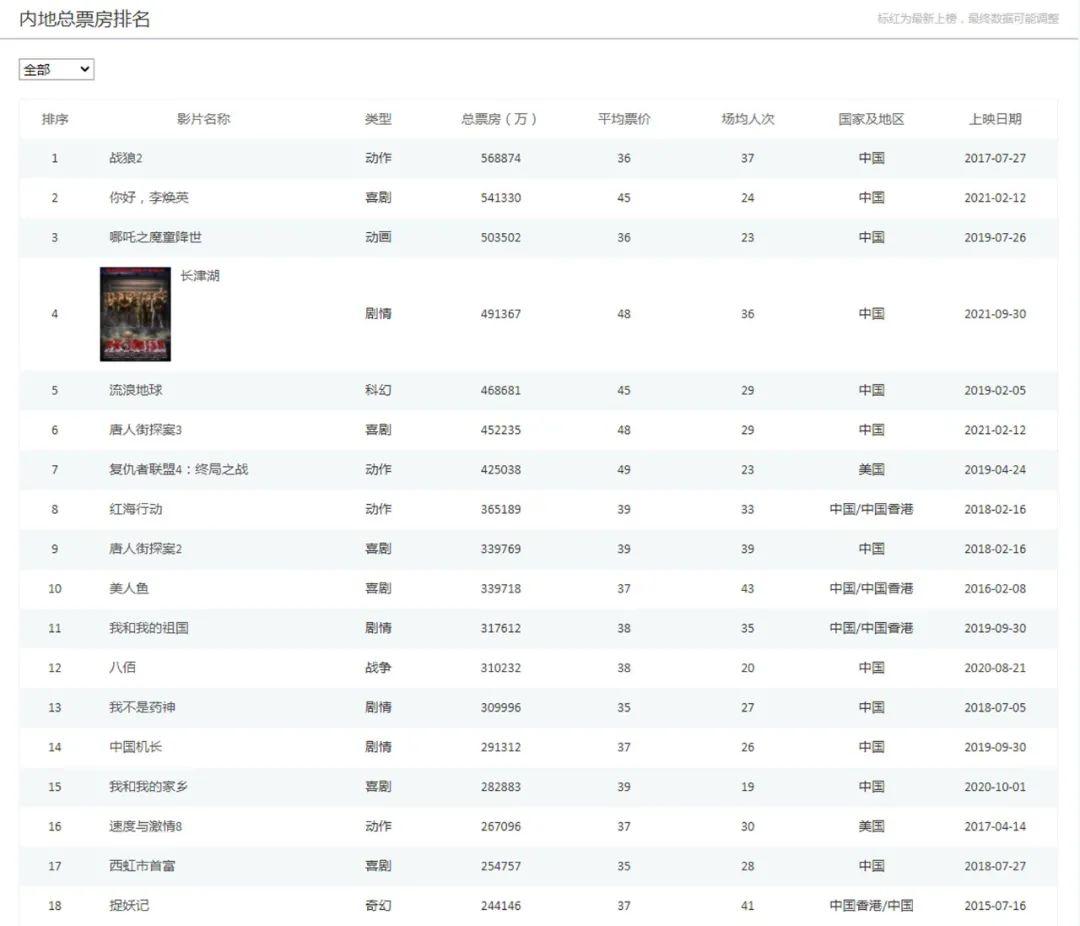中国电影总票房排名: