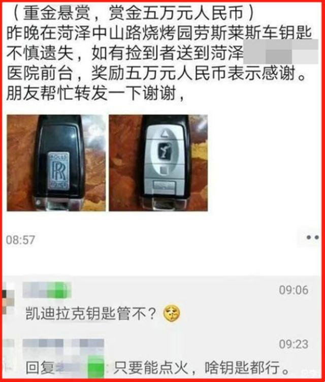 山东菏泽一位劳斯莱斯车主刘先生不小心弄丢了车钥匙,刘先生在某公园烧烤的时候,不小心弄丢了车钥匙。他和朋友在公园里找了好几圈都没有找到车钥匙,刘先生只能在网上重金悬赏。