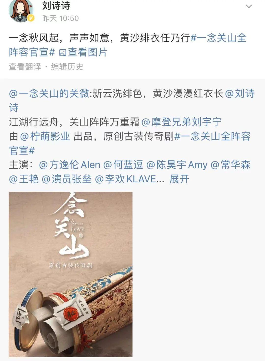 《一念关山》全阵容曝光,刘诗诗再演古装剧的词条马上冲到热搜第一。