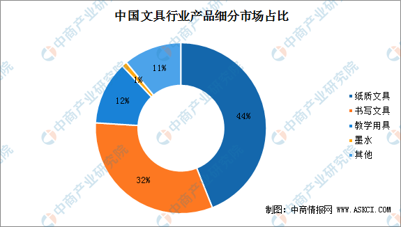 从细分产品上来看,我国文具行业的产品主要有书写文具、纸质文具、教学用品以及墨水等。其中纸质文具的市场份额占比最高,占整体文具行业市场比重的44%;其次是书写文具,占比为32%;教学用品和墨水占比分别为12%、1%。