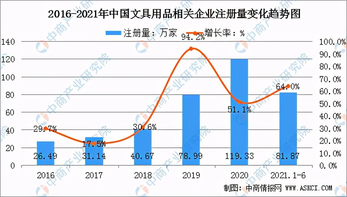 数据显示,我国目前共注册文具用品相关企业518.16万家,近10年来文具相关企业年注册量逐年攀升。2019年增速是近10年来最高的,同比增长94.2%。2020年是注册量最多的年份,共新增119.33万家,同比增长51.1%。2021年上半年新注册企业81.87万家,同比增长64%。