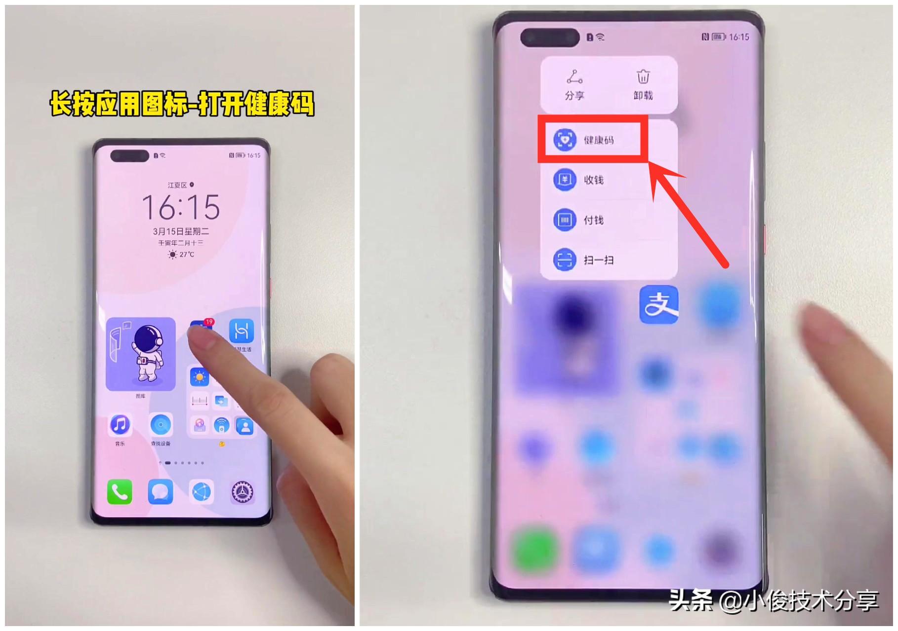 除了进入支付宝界面打开健康码之外,很多手机都提供了应用快捷方式,我们只需长按这个应用图标就能快速操作一些常用功能!