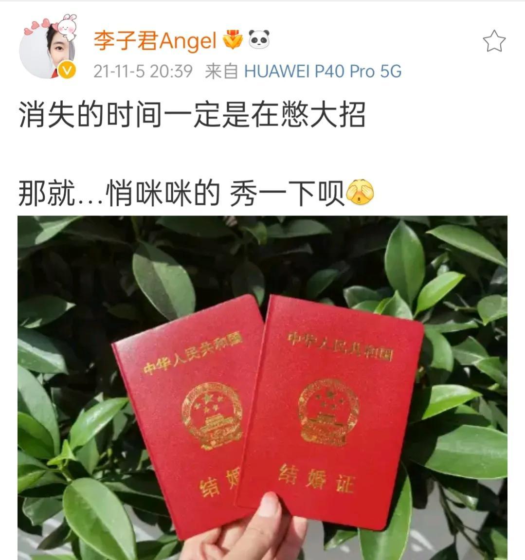 李子君则是于2017年宣布退役,在此之后就很少更新社交媒体了,在2021年8月份在社交媒体上李子君公布了自己谈恋爱的消息,11月就晒出了结婚证,2022年6月1日晒出大肚照。